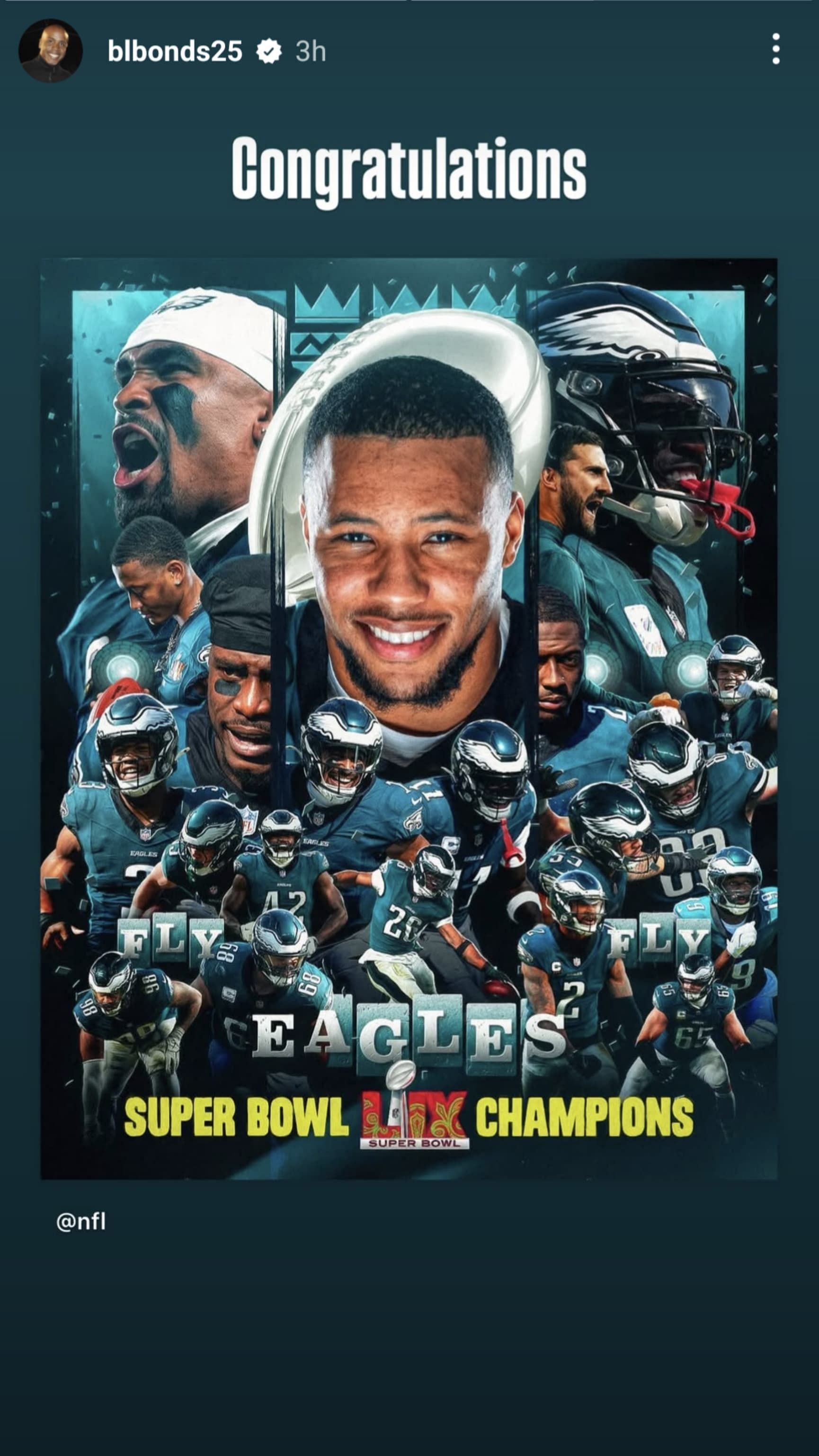 "Congratulations," Bonds wrote in his Instagram story with a poster of the Eagles' Super Bowl win.