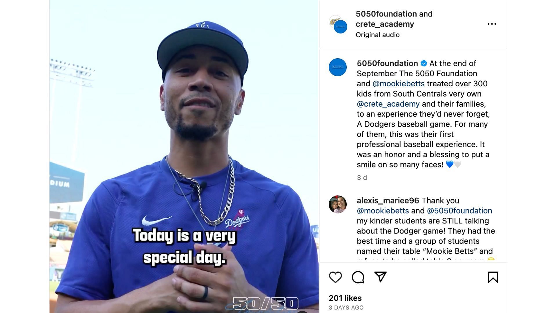 "At the end of September The 5050 Foundation and @mookiebetts treated over 300 kids from South Centrals very own @crete_academy and their families, to an experience they’d never forget, A Dodgers baseball game. For many of them, this was their first professional baseball experience. It was an honor and a blessing to put a smile on so many faces! At the end of September The 5050 Foundation and @mookiebetts treated over 300 kids from South Centrals very own @crete_academy and their families, to an experience they’d never forget, A Dodgers baseball game. For many of them, this was their first professional baseball experience. It was an honor and a blessing to put a smile on so many faces!" - 5050 Foundation on Instagram