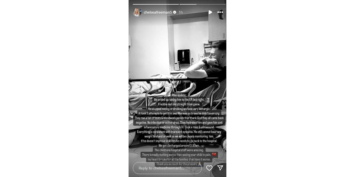 Freddie Freeman’s wife, Chelsea Freeman, previously shared her younger son Maximus’ health update on Instagram, saying he developed transient synovitis. However, things got much worse from there, as their son was admitted to the ER Wednesday night, Chelsea shared on Instagram on Thursday.