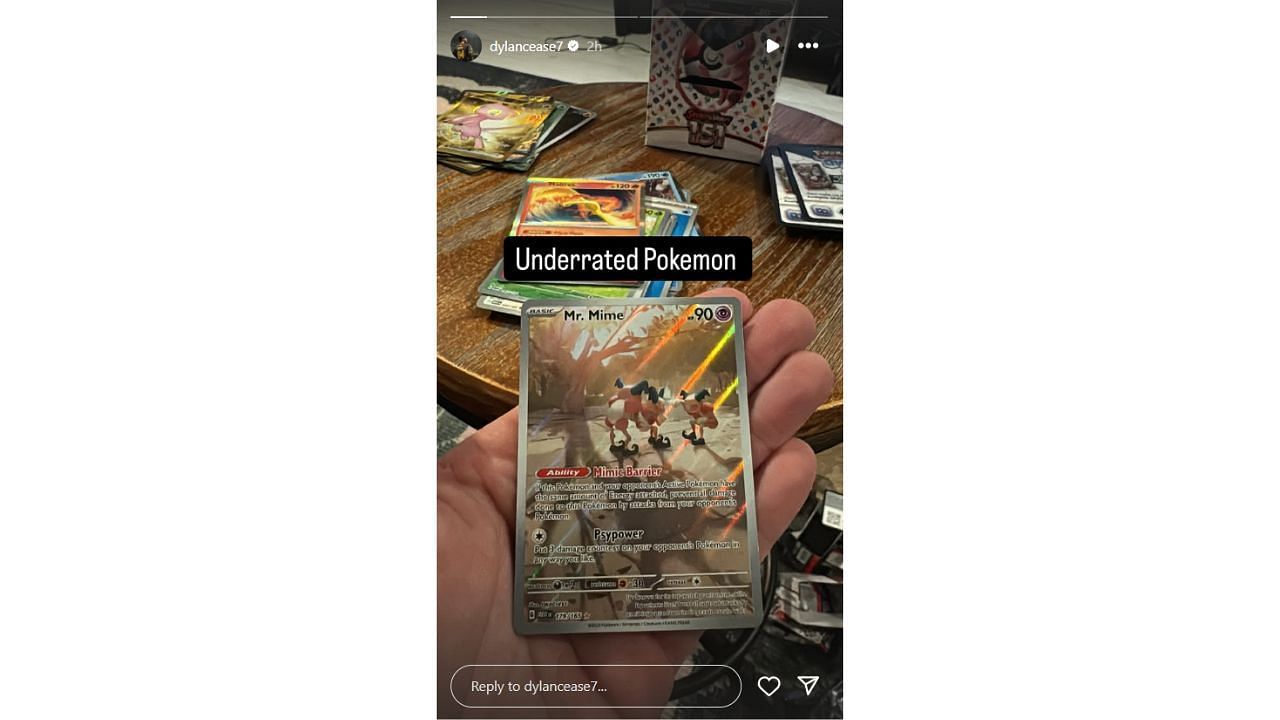On Wednesday, Cease shared a holographic Mr. Mime card, calling the Pokémon "Underrated." The snapshot reveals Cease's appreciation for the strategic element of the card game.