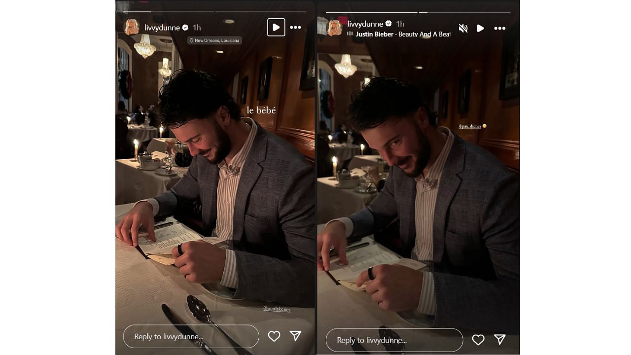 The caption on the image says "Le Bébé," which is French for "the baby," implying a term of endearment. In another snap, Paul Skenes can be seen rolling his eyes, sneakingly looking at the camera held by her social media star girlfriend.