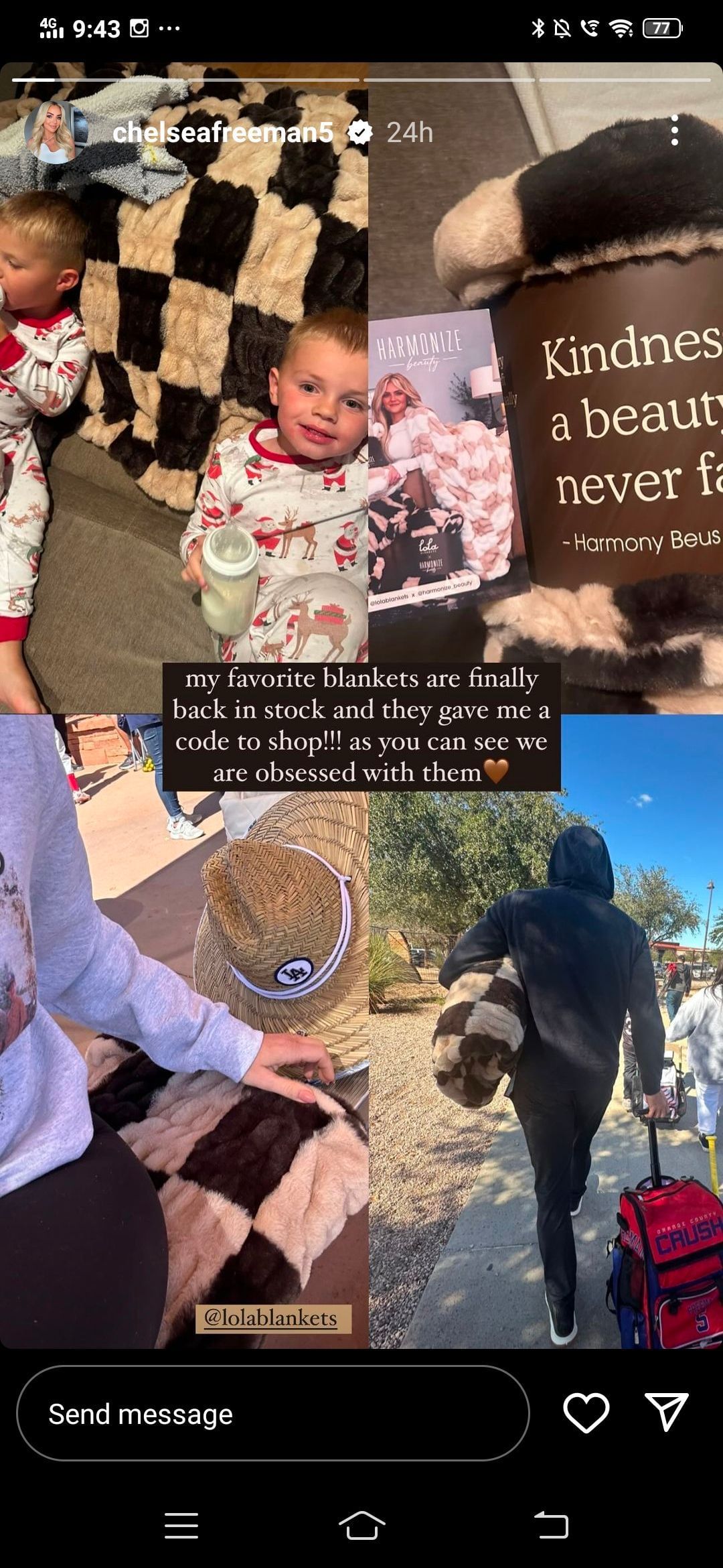 "My favorite blankets are finally back in stock and they gave me a code to shop!!! As you can see, we are obsessed with them."