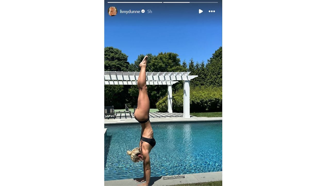 On the side of a pool, Dunne was in a handstand position, highlighting her gymnastic abilities off the mat as well. She wore a black swimsuit from Vuori and tagged the brand in her story.
