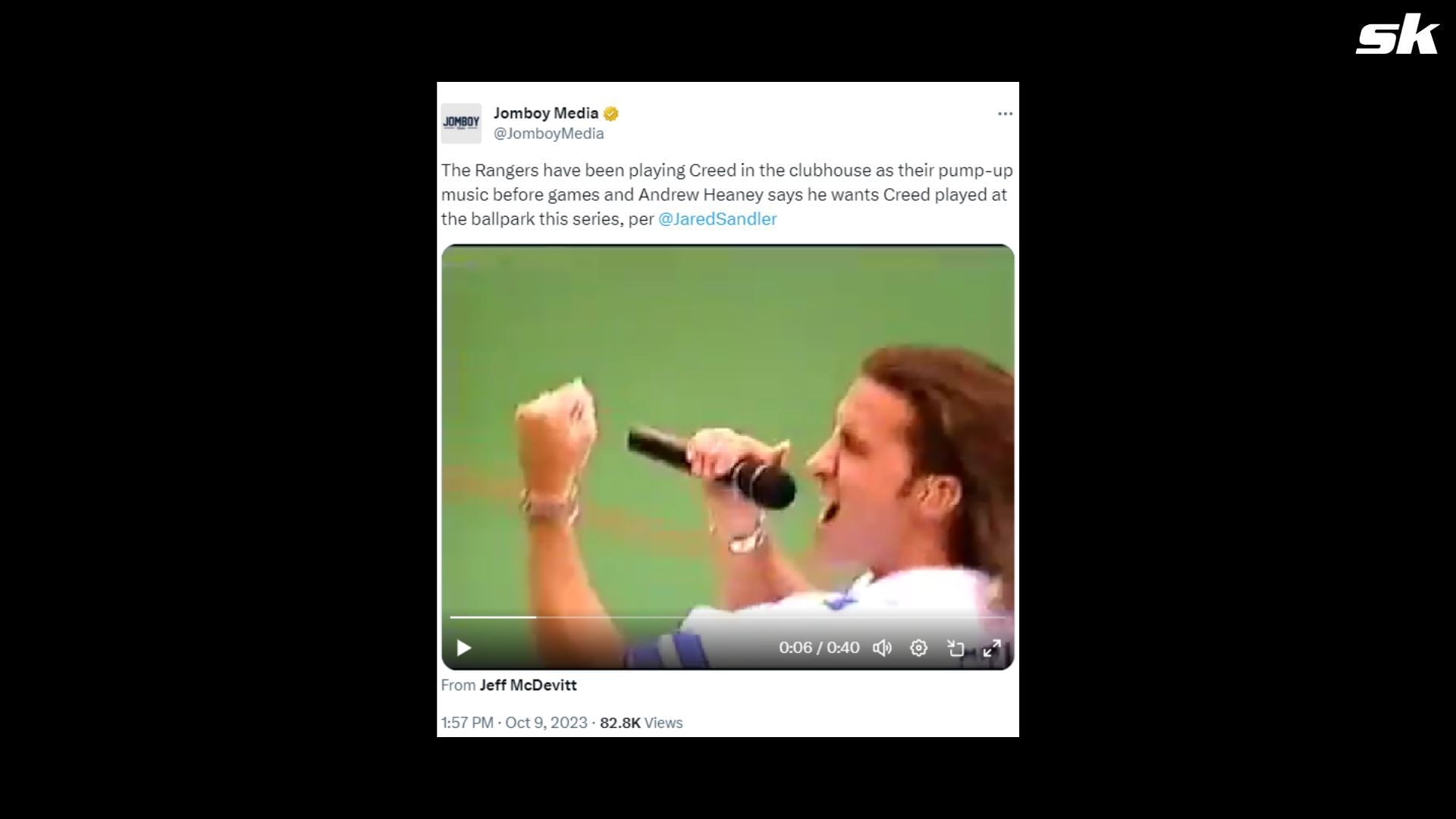 "The Rangers have been playing Creed in the clubhouse as their pump-up music before games and Andrew Heaney says he wants Creed played at the ballpark this series, per @JaredSandler" - JomboyMedia