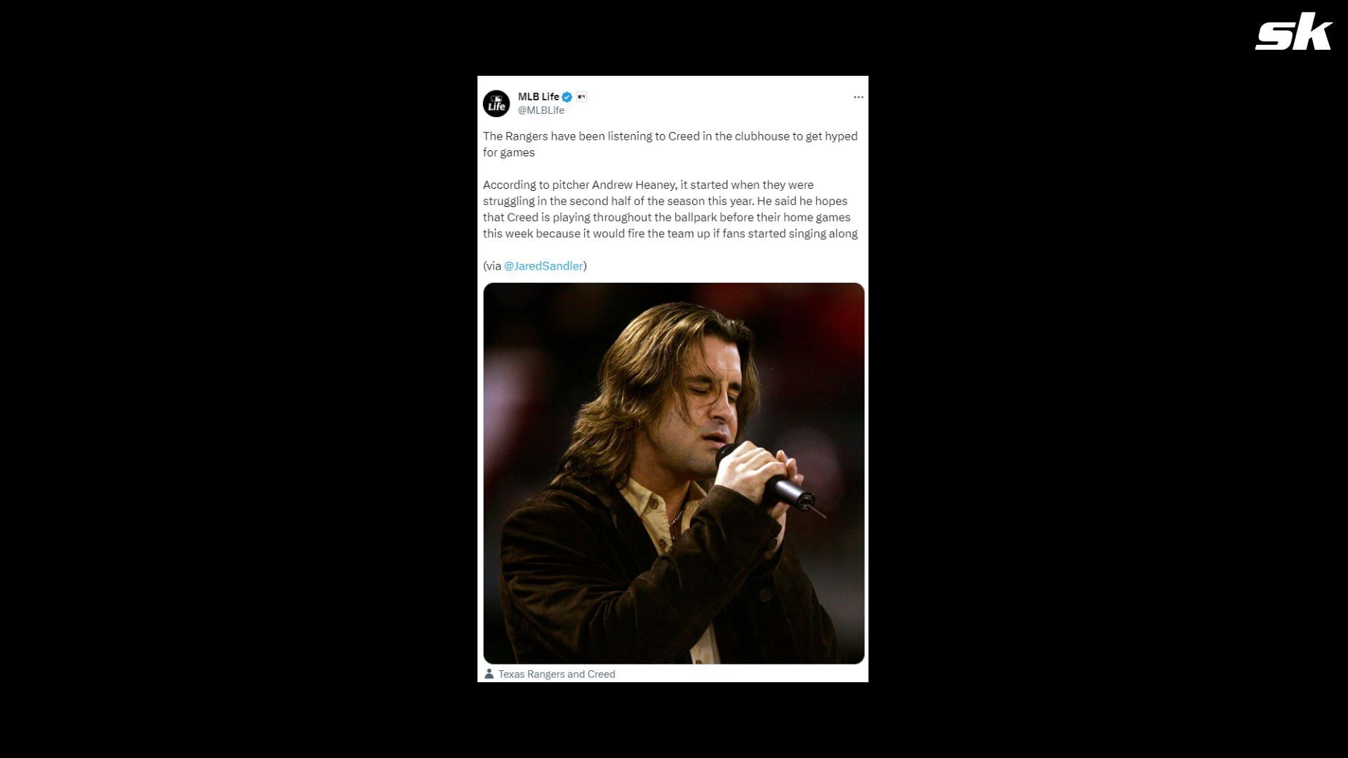 "The Rangers have been listening to Creed in the clubhouse to get hyped for games. According to pitcher Andrew Heaney, it started when they were struggling in the second half of the season this year. He said he hopes that Creed is playing throughout the ballpark before their home games this week because it would fire the team up if fans started singing along" - MLBLife