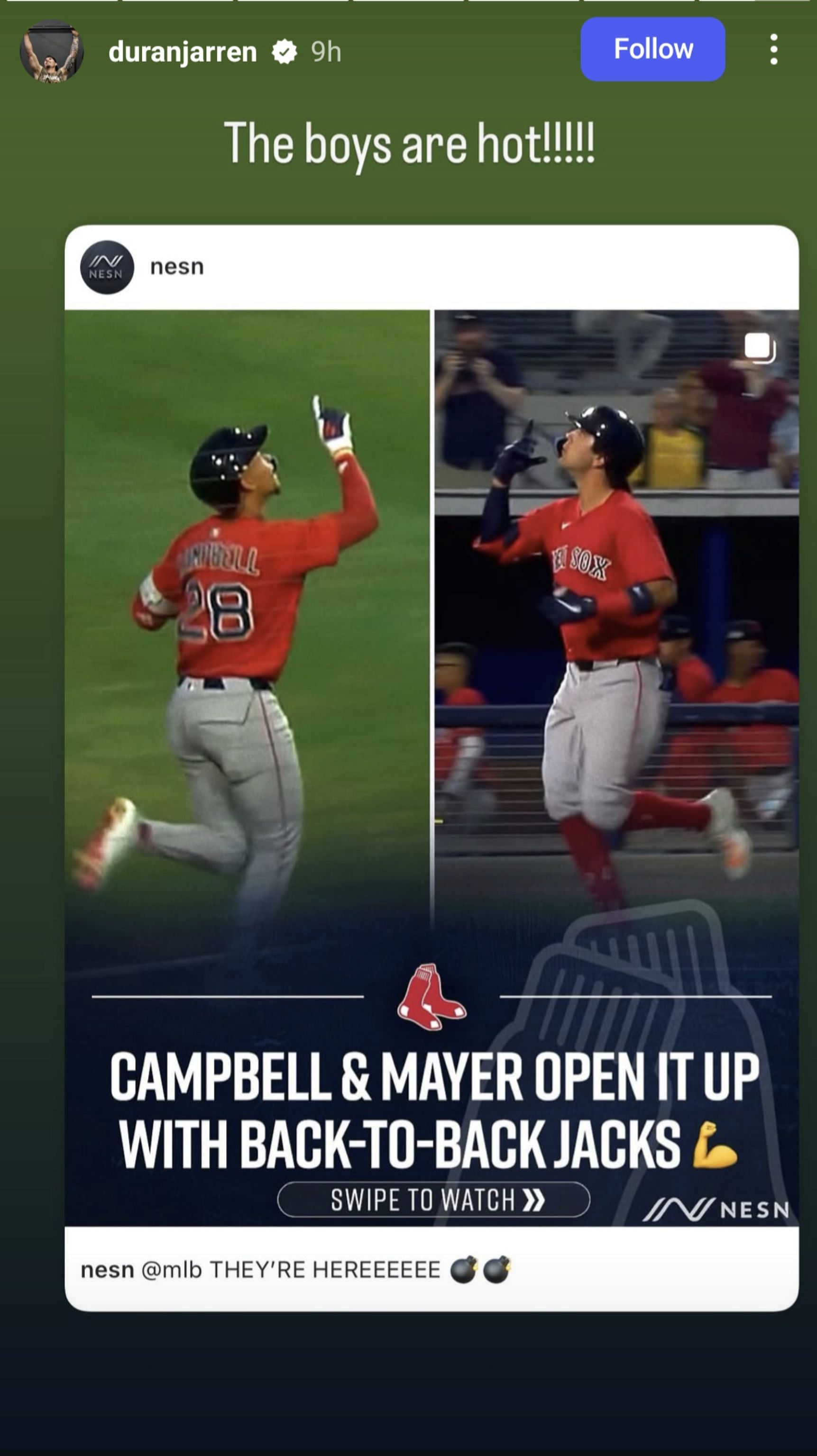Following the home runs from the "Big 3" prospects, Jarren Duran reacted to it in an Instagram story. Duran shared Campbell and Mayer's back-to-back home runs in the third inning of the game, captioning the post: