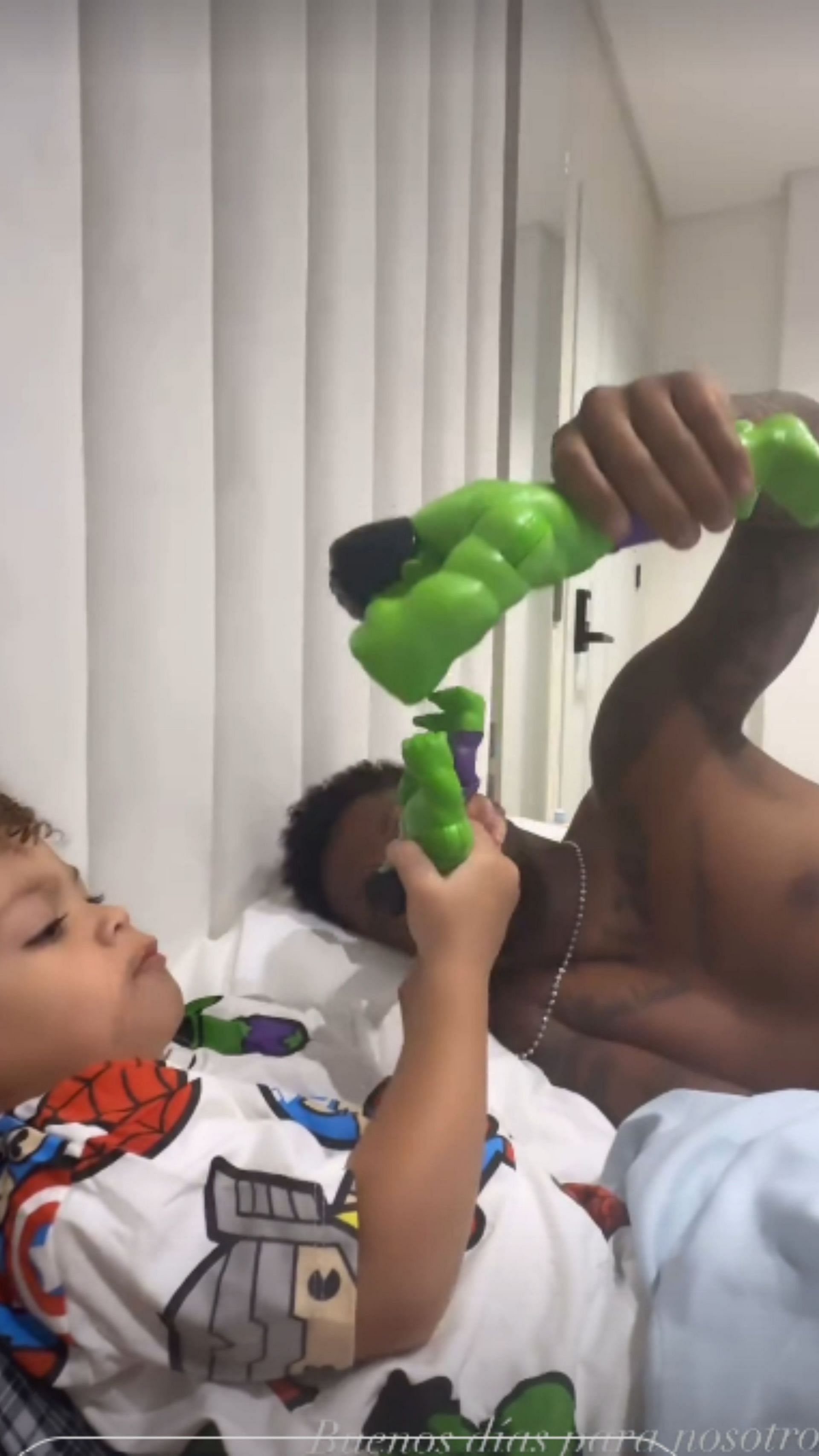 In the clip, Acuna and his oldest son engaged in a battle using Hulk toys, with Acuna wielding a slightly larger version than his son's. Maria captioned the video: