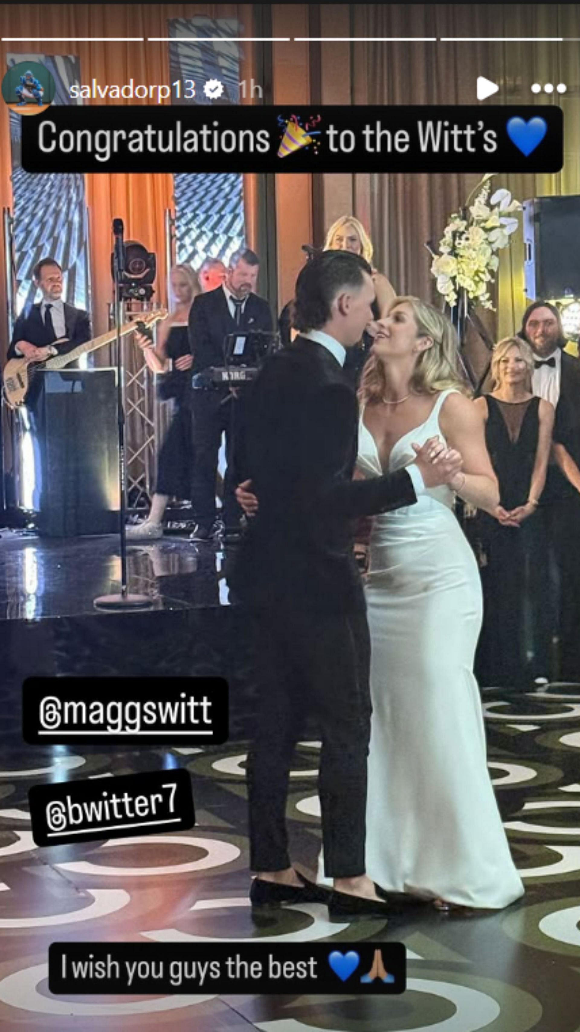 Earlier today, Perez's wife posted an emotional message on her Instagram story to Witt Jr. and his wife. The post included a video of the American League MVP finalist and his wife making their way to the wedding reception. Maggie wore a stunning white V-neck wedding dress, while Witt Jr. appeared sharp in a traditional tuxedo.