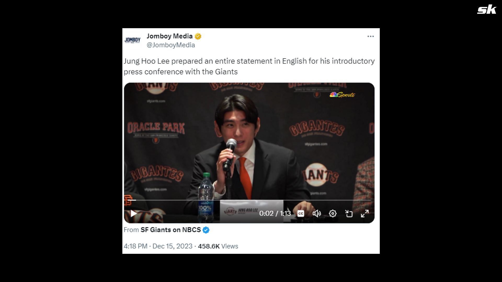 During his press conference, Jung Hoo Lee also displayed a little bit of his personality. He began by yelling "Let's Go Giants" emphatically during his English opening statement, and he dubbed himself "Grandson of the Wind" in honor of his father, Jong Beom Lee, who was referred to as the "Son of the Wind" for his lightning-fast reflexes, which the younger Lee claimed he wouldn't be able to match.