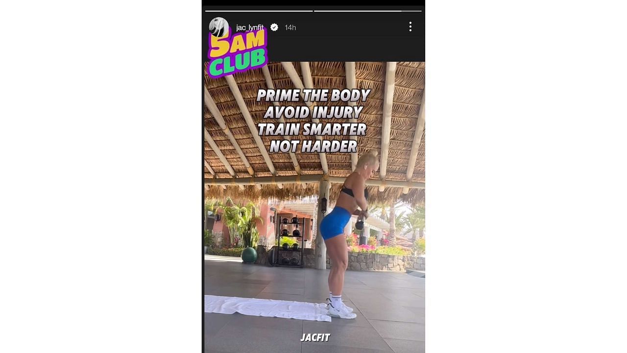 On Monday, Jaclyn Cordeiro promoted her program through a glimpse of what community member gets to experience if they join. In the clip, Cordeiro is performing a kettlebell exercise in an open, tropical-style workout area. She described and shared guidelines through overlay text on how to properly and smartly undertake this exercise.