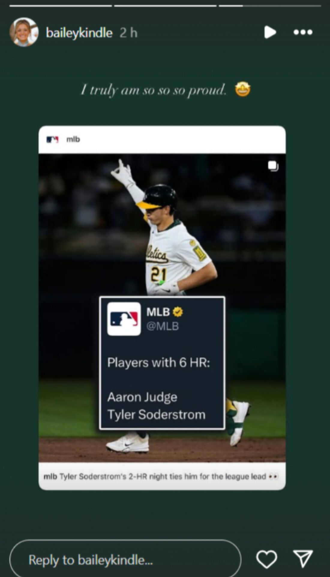"I truly am so so so proud," Bailey wrote in her Instagram story, sharing an MLB graphic of the home run leaders this season.