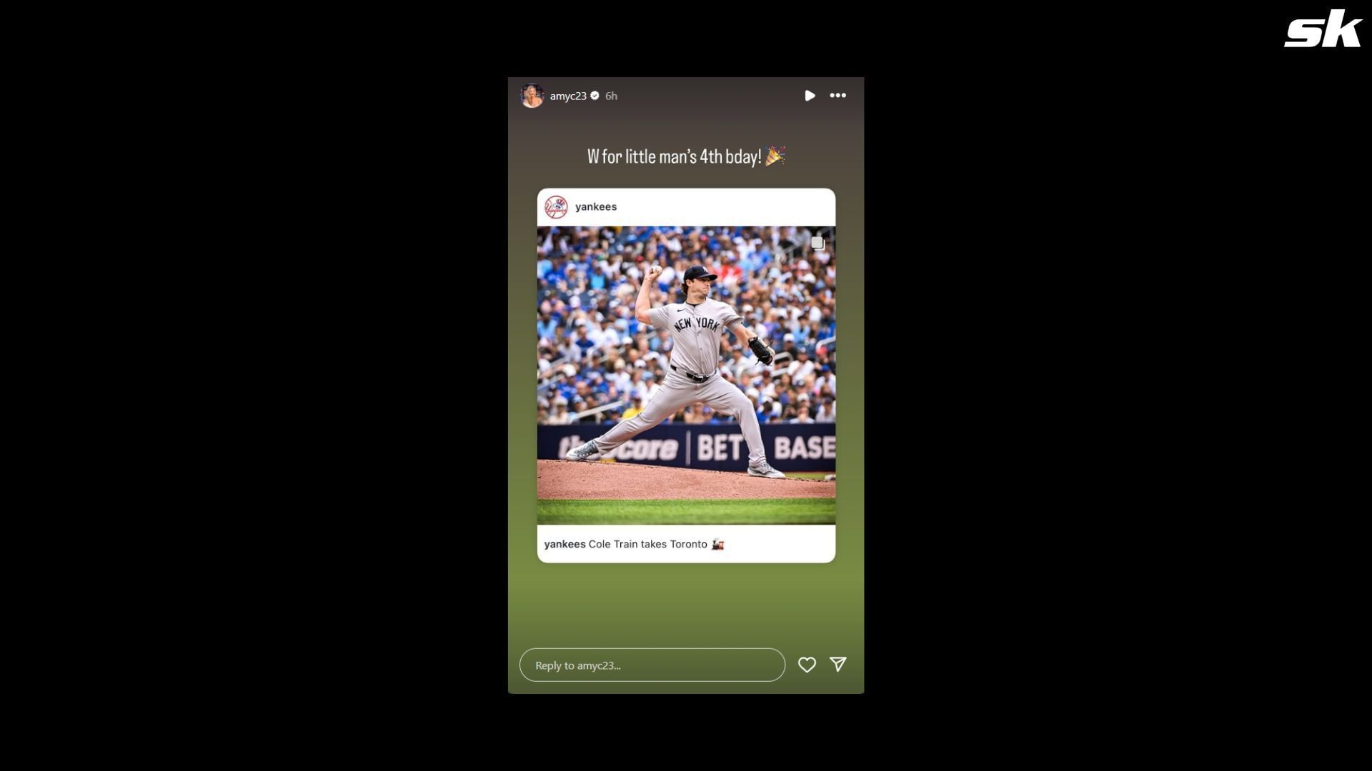 New York Yankees ace Gerrit Cole registered his first win of the campaign against the Toronto Blue Jays at Rogers Center on Sunday. His wife, Amy Cole, celebrated the Bombers ace's win by posting an Instagram story that revealed that the victory came on their firstborn son Caden's fourth birthday.