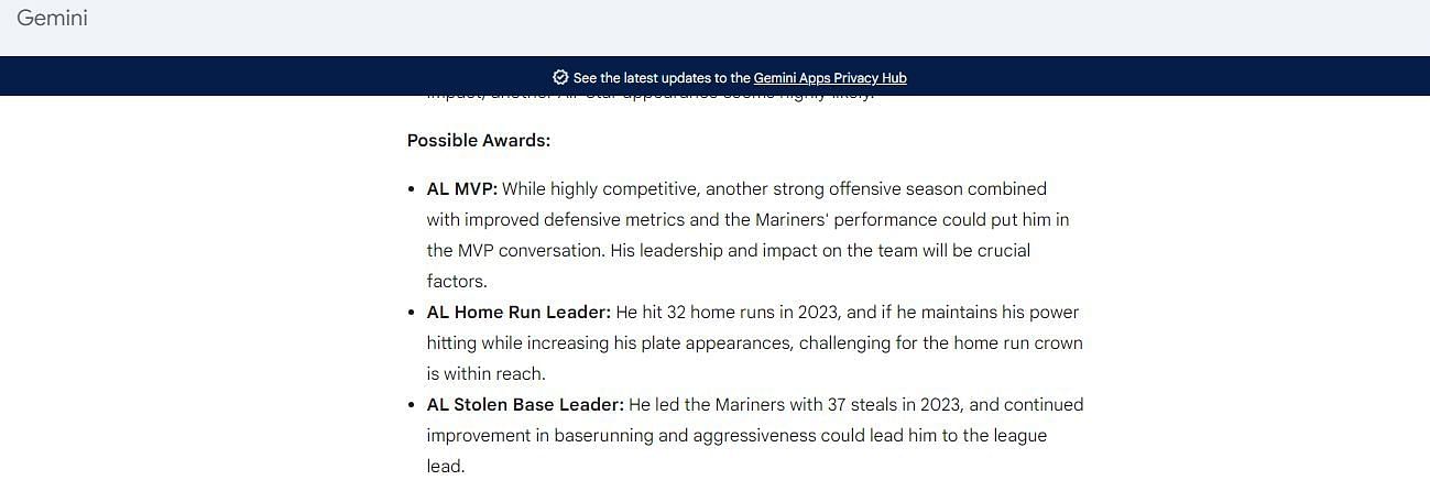 The 2024 MLB season looks promising for the center fielder, as many awards are predicted to follow. His chances of winning the AL MVP for the upcoming season are one of the other predictions made by Gemini.