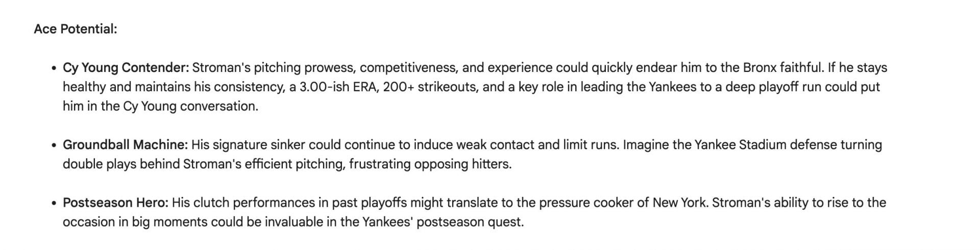 The AI envisioned Stroman as an "Ace Potential," suggesting that his pitching prowess, competitiveness, and experience could position him as a Cy Young contender. The analysis projected impressive statistics, such as a 3.00-ish ERA, 200+ strikeouts, and a pivotal role in propelling the New York Yankees deep into the playoffs.