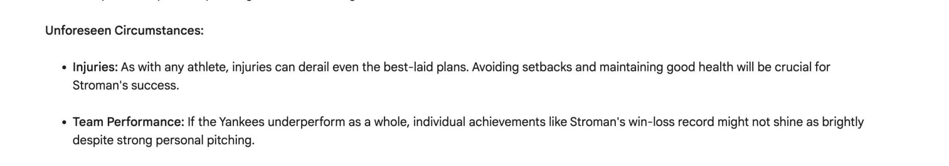 The unforeseen circumstances section highlighted the inherent uncertainties in sports, focusing on the ever-present risk of injuries and the impact of the team’s overall performance on individual achievements. Despite these various variables, the AI maintained an optimistic tone, emphasizing Stroman’s talent, adaptability, and competitive spirit as crucial elements of a promising debut season.