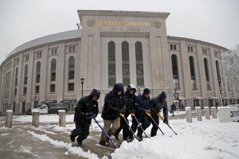 Men shovel snow from the sidewalks in front of Yankee Stadium before the Yankees home opener against the Tampa Bay Rays. A Tampa Bay Rays employee snaps a few pictures of the snow at Yankee Stadium. Snow covers the field at Yankee Stadium before what was supposed to be the Yankees' home opener. Piles of snow sit outside Citi Field before a game between the Philadelphia Phillies and New York Mets.