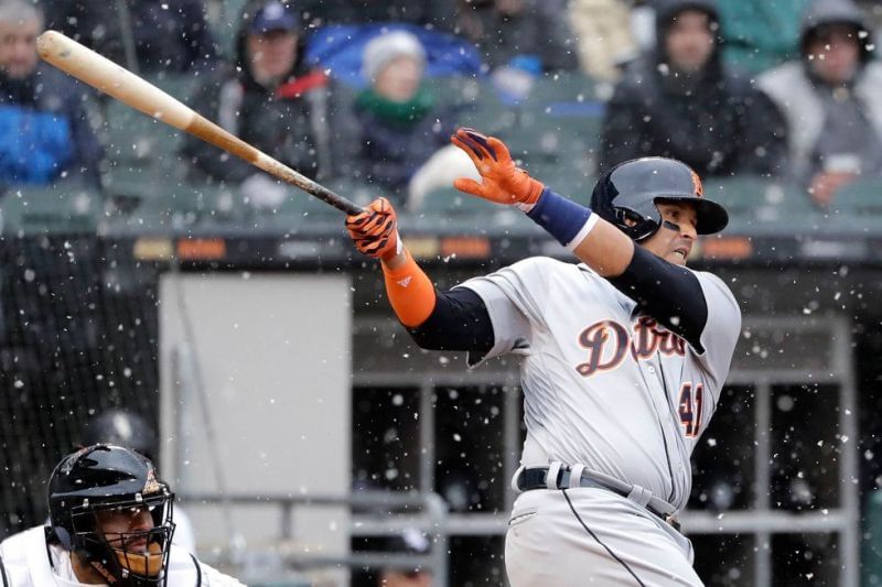 Chicago White Sox pitcher James Shields stands on the mound while pitching in the snow against the Detroit Tigers. Detroit Tigers outfielder Leonys Martin fields a ball while playing the White Sox in Chicago. Victor Martinez of the Detroit Tigers clubs an RBI single against the Chicago White Sox.
