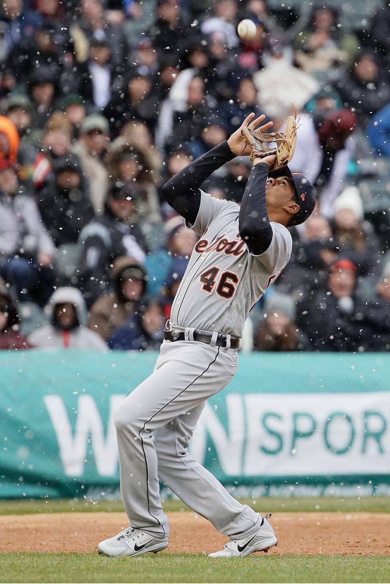 Detroit Tigers third baseman Jeimer Candelario catches a pop-up in the 4th inning of a game against White Sox in Chicago. Snow falls during the season's first game at Guaranteed Rate Field in Chicago. Chicago White Sox outfielder Avisail Garcia runs to first as snow falls in a game against the Detroit Tigers.