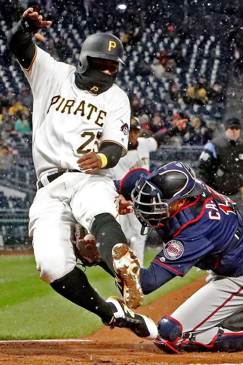 Gregory Polanco of the Pittsburgh Pirates is tagged out by Minnesota Twins catcher Jason Castro while attempting to score. Minnesota Twins slugger Miguel Sano celebrates with teammate Logan Morrison after a win against the Pittsburgh Pirates. Minnesota Twins relief pitcher Fernando Rodney tries to field a few flakes while playing for the Pittsburgh Pirates. A worker is engulfed in steam while using hot water to melt snow in the stands at Target Field in Minneapolis. Snow piled on the television platform next to the Minnesota Twins dugout at Target Field.