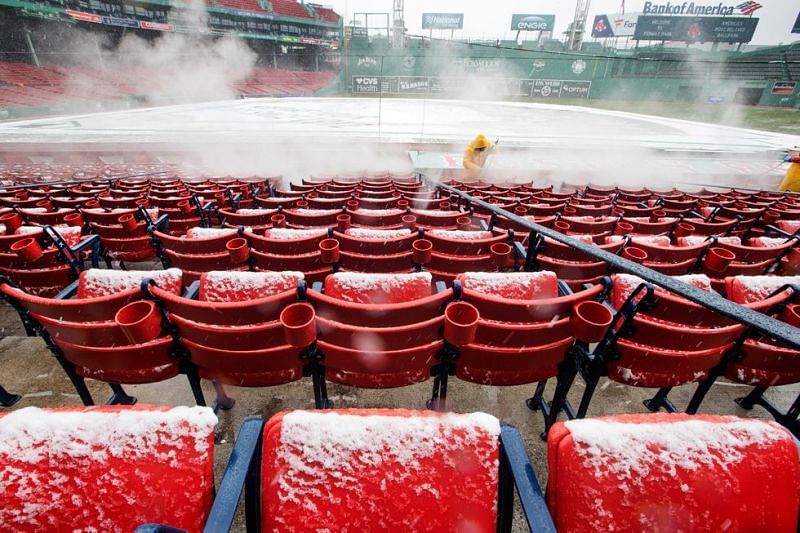 Members of the maintenance crew use pressure washers to clear snow off of the seats and clean the aisles at Fenway Park in Boston. A member of the grounds crew works at Fenway Park in Boston during a morning snowfall.
