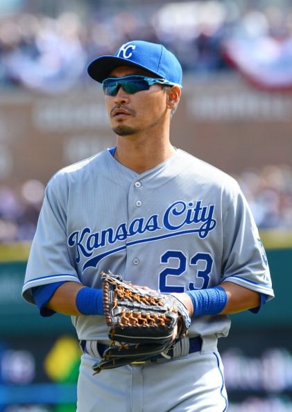 Norichika Aoki #23 of the Kansas City Royals looks on during the game against the Detroit Tigers at Comerica Park on March 31, 2014 in Detroit, Michigan. The Tigers defeated the Royals 4-3.
