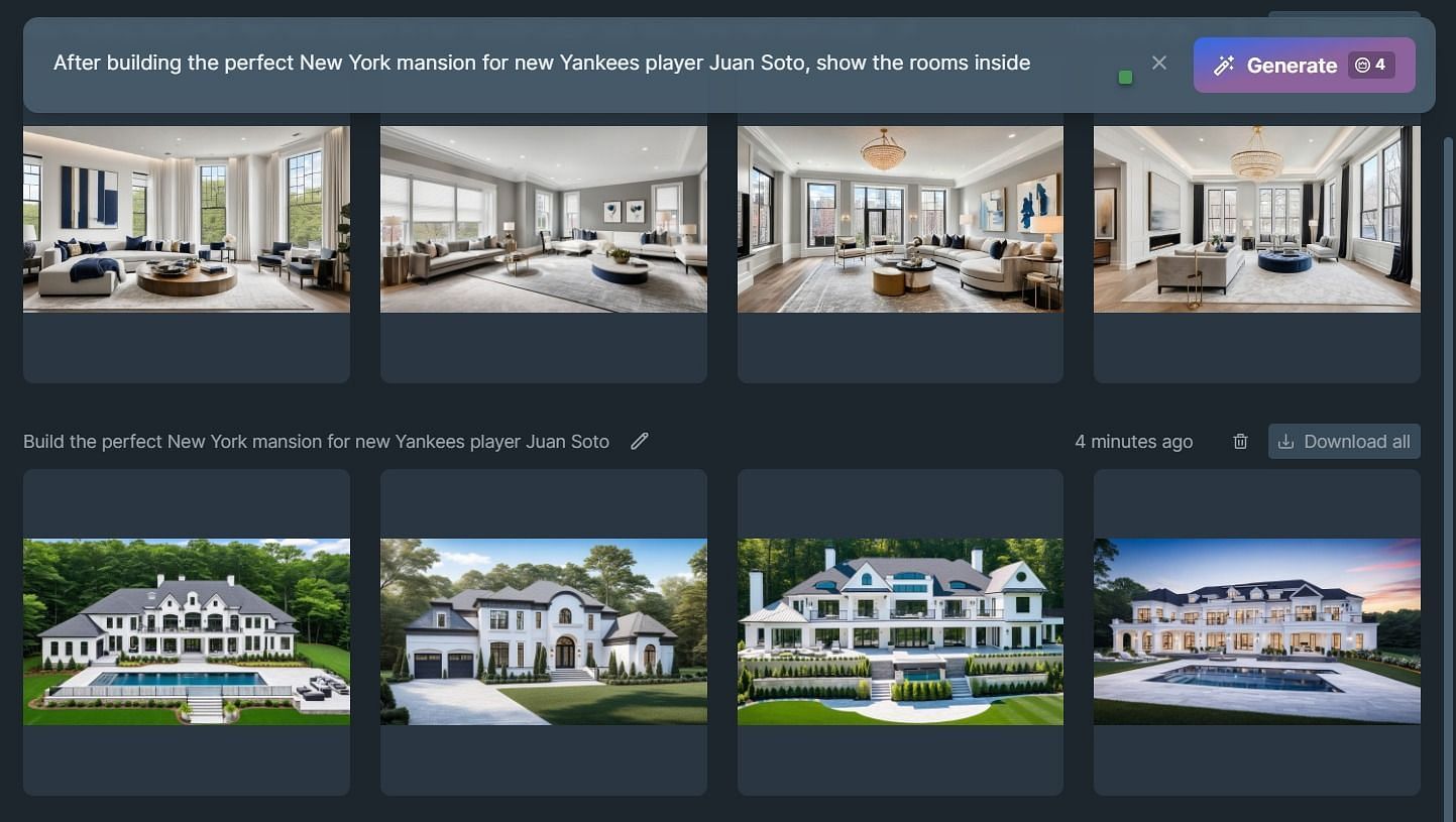 Google Bard AI made Juan Soto's ideal New York residence, a modern masterpiece boasting stunning views of the city skyline. Ideally situated in a quiet and upscale neighborhood, it would offer proximity to public transportation and all the amenities that a young, single athlete could desire. The mansion itself would exude spaciousness and luxury, featuring a swimming pool, gym, and ample outdoor space for entertainment.