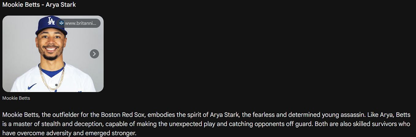 Like Arya Stark, LA Dodgers star leadoff hitter Mookie Betts is a fearless and young assassin, and AI found him to be a perfect match for the one who assassinated the Night King in the series.