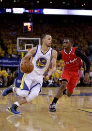 Stephen Curry drives to the basket past Chris Paul en route to his 14 points in the first quarter in Game 6.