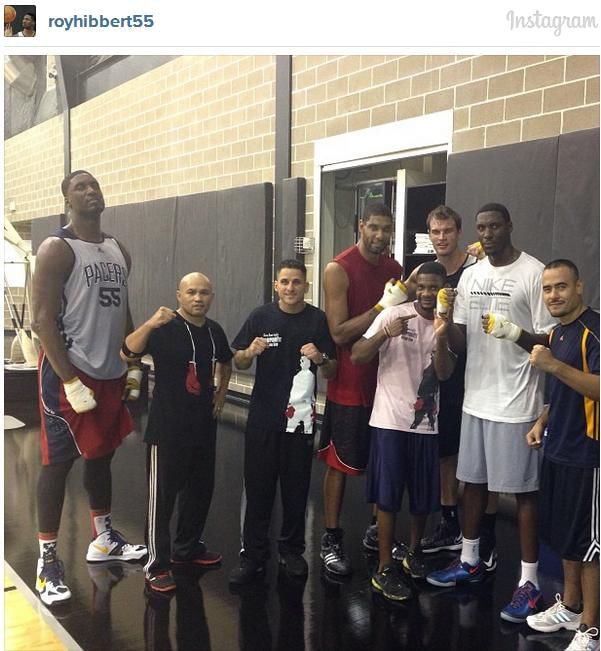 Hibbert posted a picture of himself on his Instagram account after a workout. He virtually dwarfs both Ian Mahinmi and Duncan who are listed at 6’11′at 230lbs.