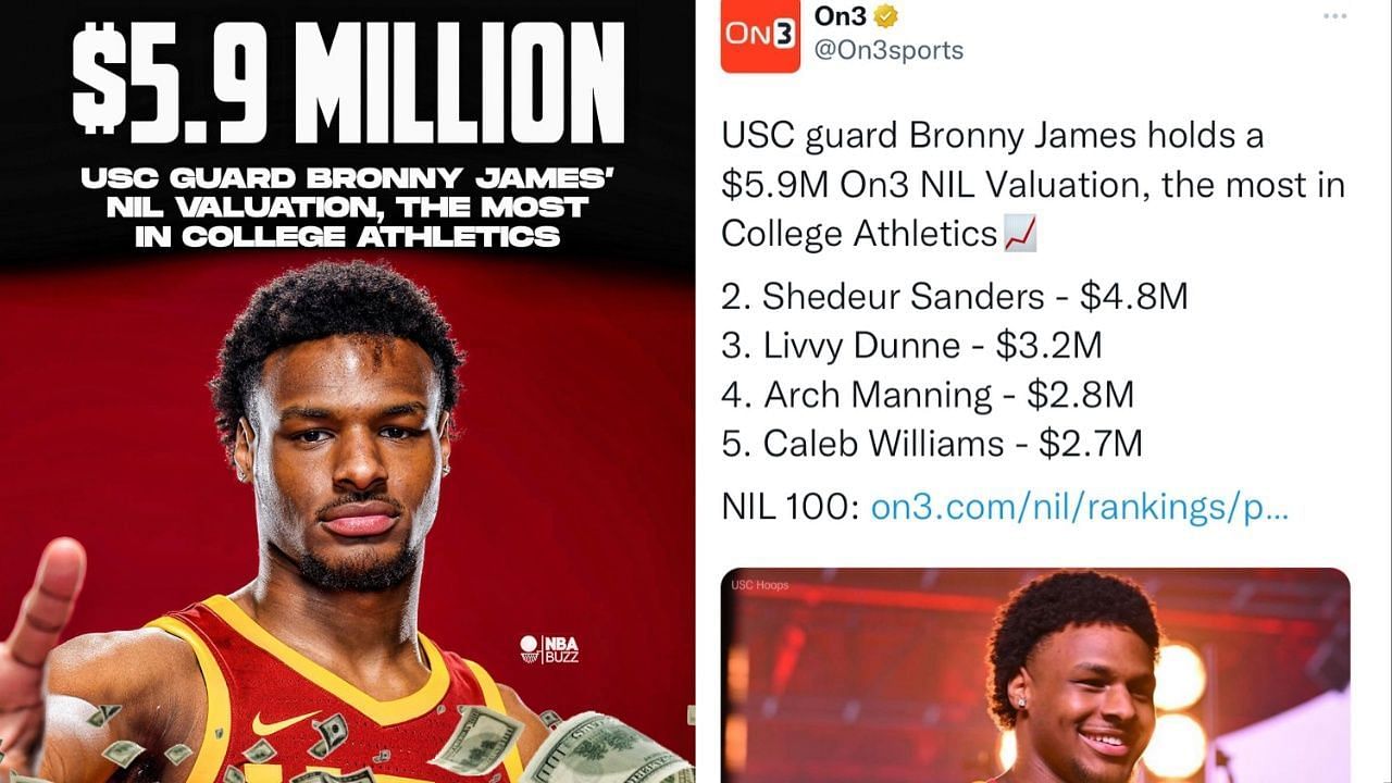 According to the premier college sports and recruiting digital media company, On3, Bronny James holds the number one spot on NIL Valuation with a staggering $5.9 million, the most in Collegiate Athletics.