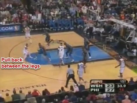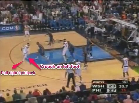 Now this change of direction is accompanied with Iverson getting into the runner’s stance. Like a sprinter at the starting block, he crouches down low, ready to power ahead. Look at how efficiently he gets into it. First he pulls the ball back between his legs, then with his left foot, he crouches down low while simultaneously pulling his right leg back.