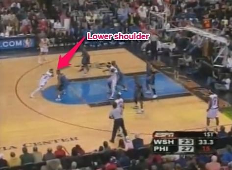 Normally, one would move one of the two feet forward when wanting to move forward. Iverson gets off the block with uber efficiency. Instead of moving ahead, he gets down low and ploughs ahead while lowering his shoulder.