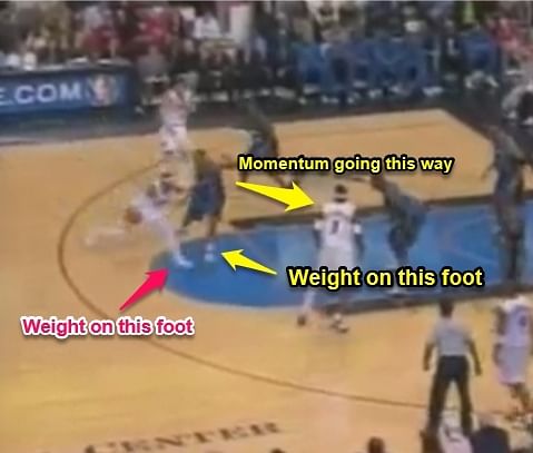 Watch as Iverson stops on his left foot here. He doesn’t just stop. While moving at a good speed, he plants his foot ahead of his body and applies the brakes with it.