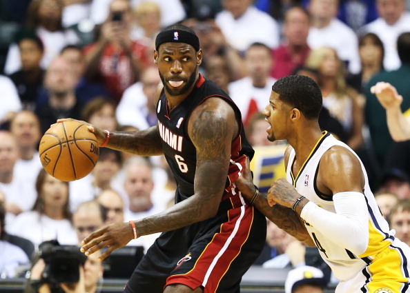 LeBron James #6 of the Miami Heat drives against Paul George #24 of the Indiana Pacers during Game Three of the Eastern Conference Finals at Bankers Life Fieldhouse on May 26, 2013 in Indianapolis, Indiana. (Getty Images)