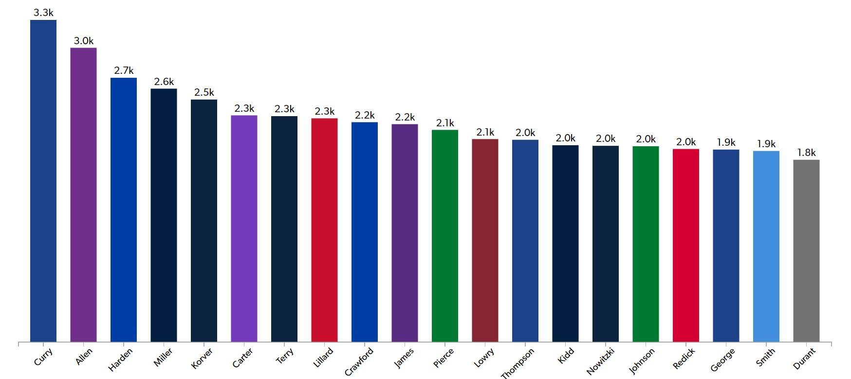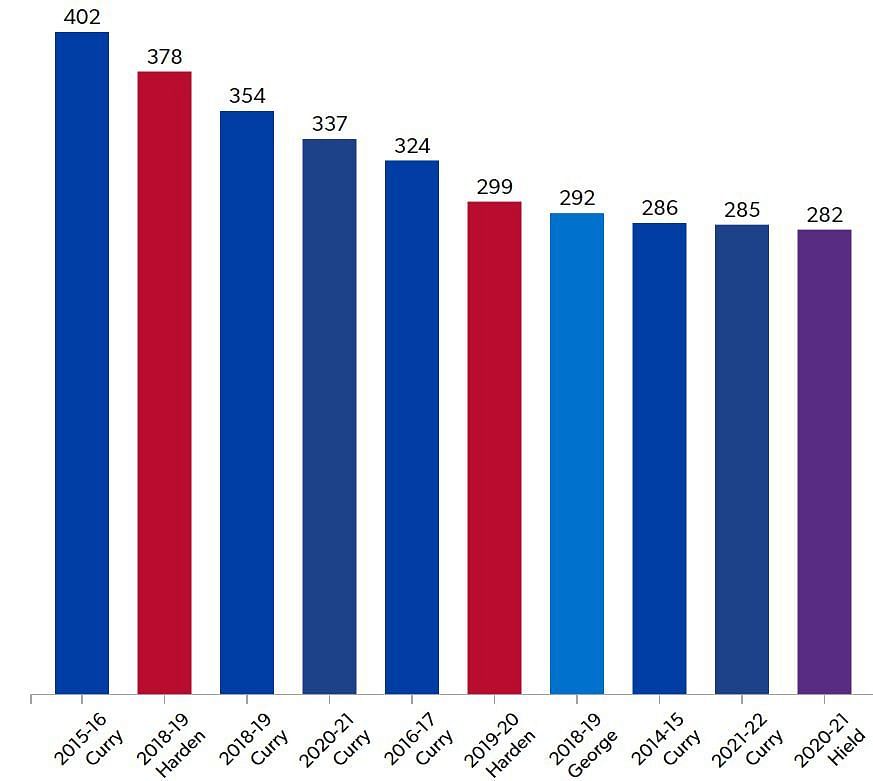 In the 2015-16 NBA season, Steph Curry became the first player in the NBA to hit 400+ three-pointers in a regular season. He dropped in 402 threes in 886 attempts, at a blistering 45.6 shooting percentage. He holds four of the five highest regular season three-pointers made totals, with James Harden holding the other one. Harden dropped 378 three-pointers in the 2018-19 season. However, it took him over 1000 attempts to hit that mark. Steph Curry sets himself apart in both his volume and efficiency. He is in a league of his own.