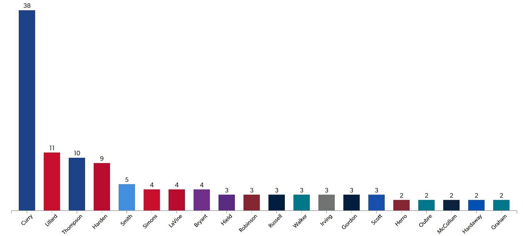 Steph has had 38 games where he's made atleast 9 three-pointers. To put how insane this is into context, the next highest player in this category is Damian Lillard, with 11 of these games, followed by Klay Thompson, who has 10 of them.