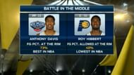 Anthony Davis had 21 points on 8 of 18 shooting on the floor with 9 rebounds but he was less effective than usual as West and Hibbert muscled him up in the paint.