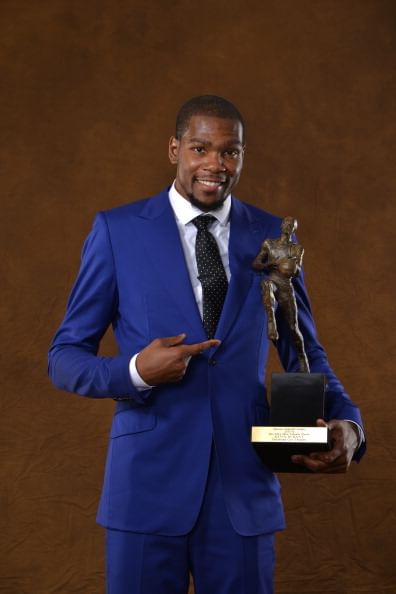 Kevin Durant accepted the award with all his teammates and Thunder coaching staff in attendance along with his friends and family at a small function during which he stepped up to give one of the most memorable and emotional acceptance speeches ever seen.