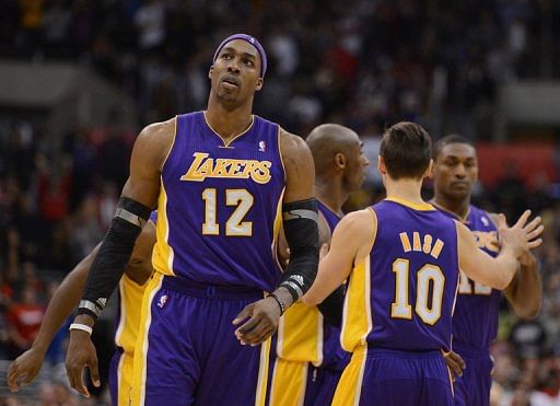 Dwight Howard (L) of the Los Angeles Lakers leaves the court on January 4, 2013. The Lakers celebrated Howard’s return from injury with a 113-93 NBA victory Sunday over Cleveland that ended the Lakers’ worst losing streak in six years.