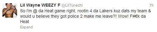 And last night, in appreciation of good rap music and as a stand against what Lil Wayne spews out, the rapper was ejected from the game for rooting for the Lakers. Or at least that’s what I like to believe. Much more fun than accepting that he left on his own accord due to some disagreement with the security staff. “In response to your inquiry, please note that Lil Wayne was not ejected from the building. He chose to leave,” said a Heat representative.