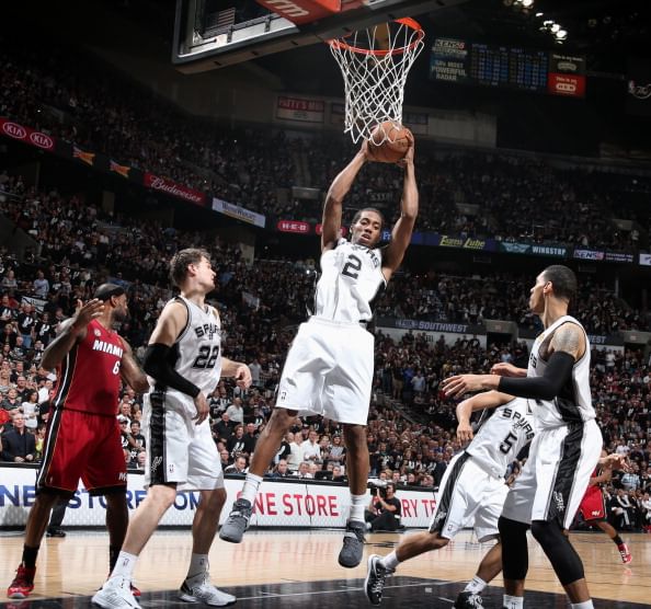 Kawhi Leonard #2 of the San Antonio Spurs rebounds the ball while playing against the Miami Heat during Game Three of the 2013 NBA Finals on June 11, 2013 at the AT&T Center in San Antonio, Texas. (Getty Images)