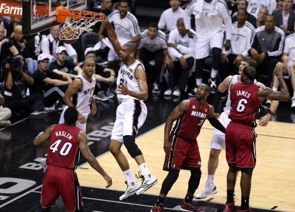 Tim Duncan #21 of the San Antonio Spurs dunks the ball against Udonis Haslem #40 of the Miami Heat in the first quarter during Game Three of the 2013 NBA Finals at the AT&T Center on June 11, 2013 in San Antonio, Texas. (Getty Images)