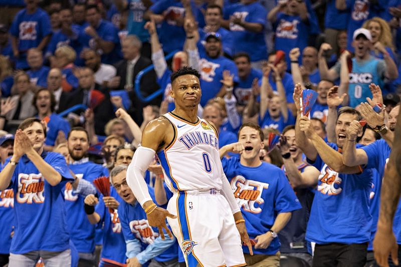 Russell Westbrook #0 of the Oklahoma City Thunder celebrates after making a three-point shot