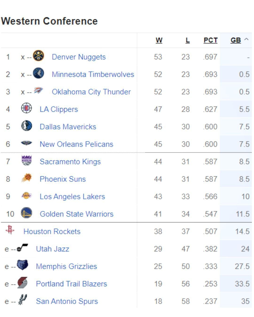 On the other hand, the Lakers could drop one spot, as they only lead the 10th-placed Golden State Warriors (41-34) by 1.5 games. However, that should be their floor, given their 4.5-game cushion over the 11th-placed Houston Rockets (38-37).