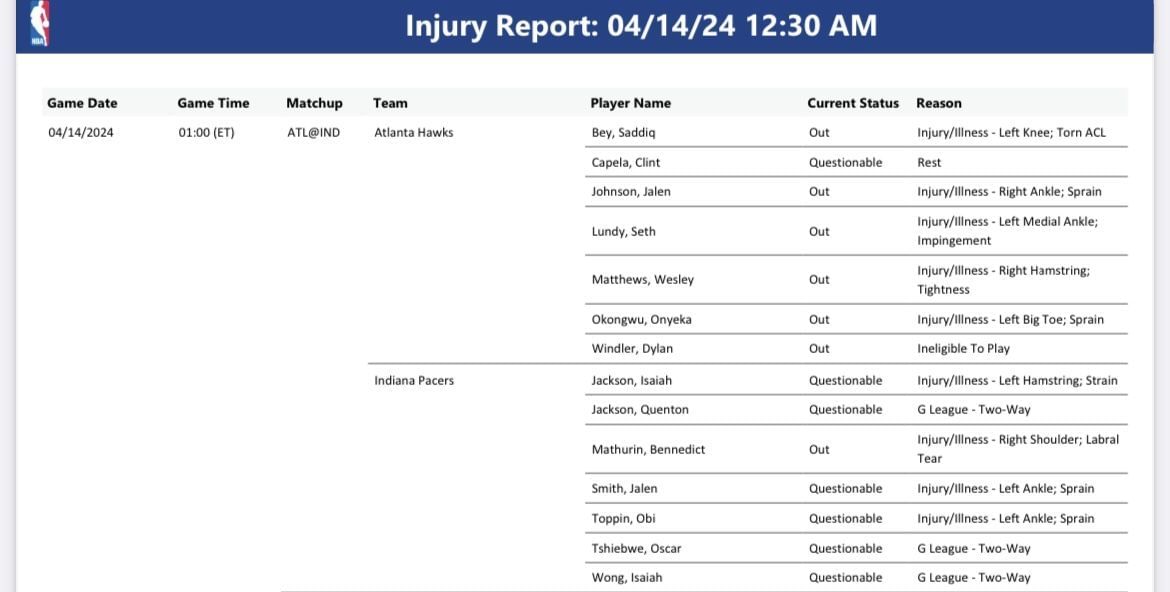 The Atlanta Hawks and Indiana Pacers play at 1 p.m. Eastern Time. The Hawks (36-45) have secured the 10th spot, while the Pacers (46-35), Orlando Magic and the Philadelphia 76ers all have the same record, holding spots four through seven.