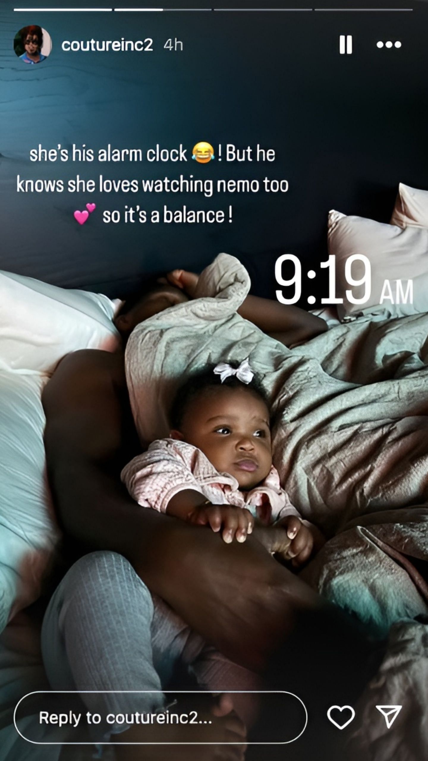 Robel wrote in the caption that their daughter has been Edwards' alarm clock, but watching "Finding Nemo" keeps her from waking up the NBA star.
