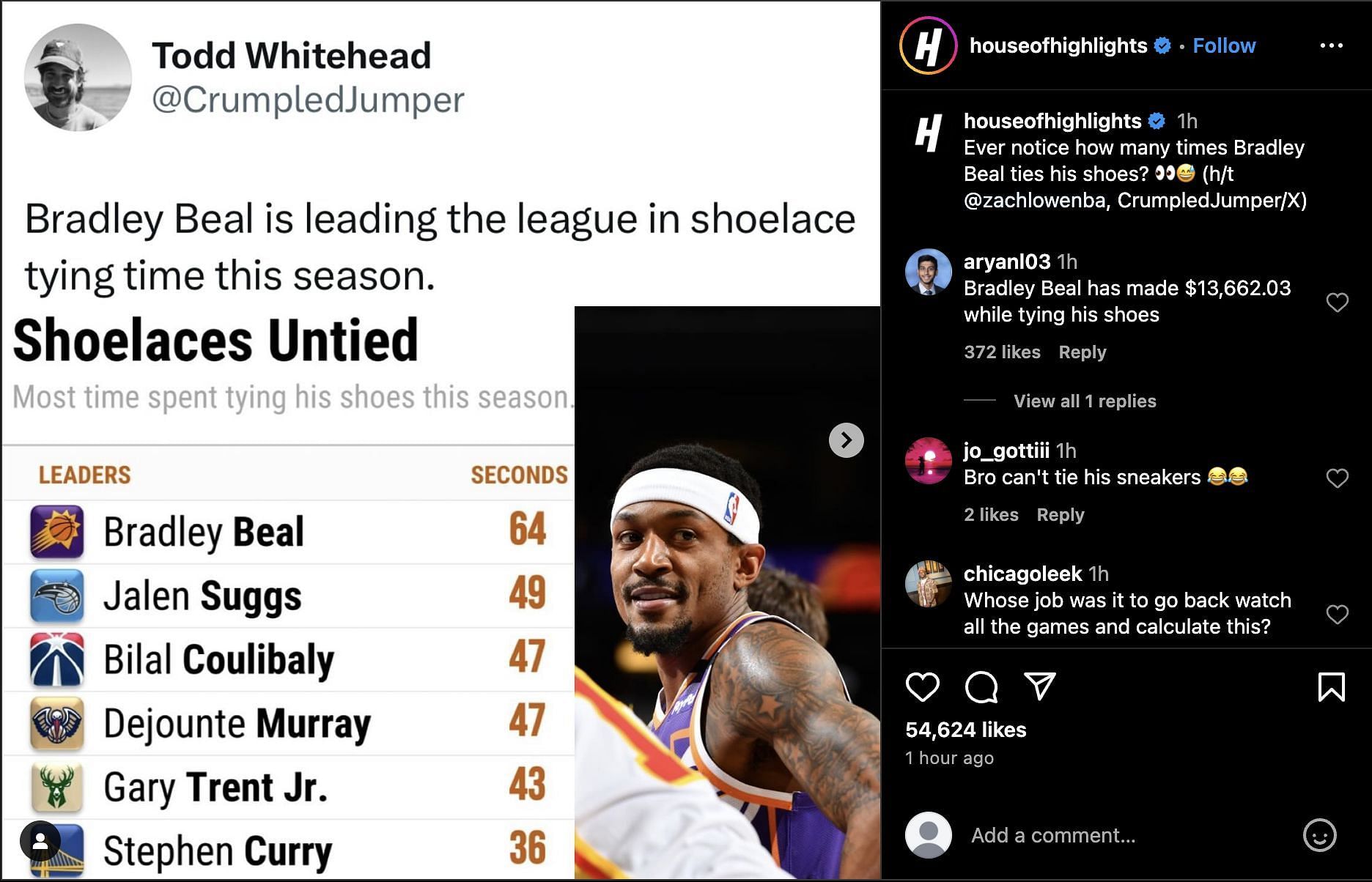 Phoenix Suns star Bradley Beal has recently emerged as the league leader in a very unique stat category. Beal leads the league in most time spent tying his sneakers (64 seconds), beating second-place Jalen Suggs by 15 seconds. This amusing stat has garnered interesting responses from NBA fans on social media.