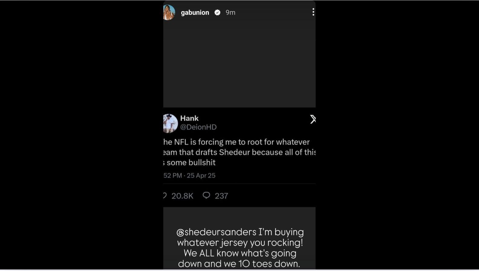 Sanders' friends and fans across pop culture have reached out to offer their support to the young prospect, assuring him that they still have his back. One of those voices is Gabrielle Union, Dwyane Wade's wife and a big fan of Sanders. Union is an avid sports fan, from following her husband's NBA career to following college football closely, which is where she discovered Shedeur Sanders' talent.
