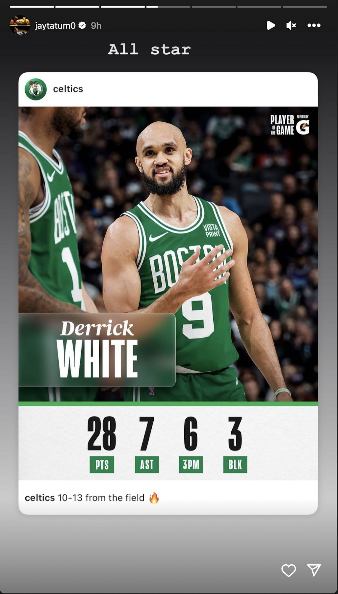 After the game, Jayson Tatum took to Instagram, where he reposted Derrick White's stat line from the evening on his Instagram Story. Along with the photo, he simply wrote: