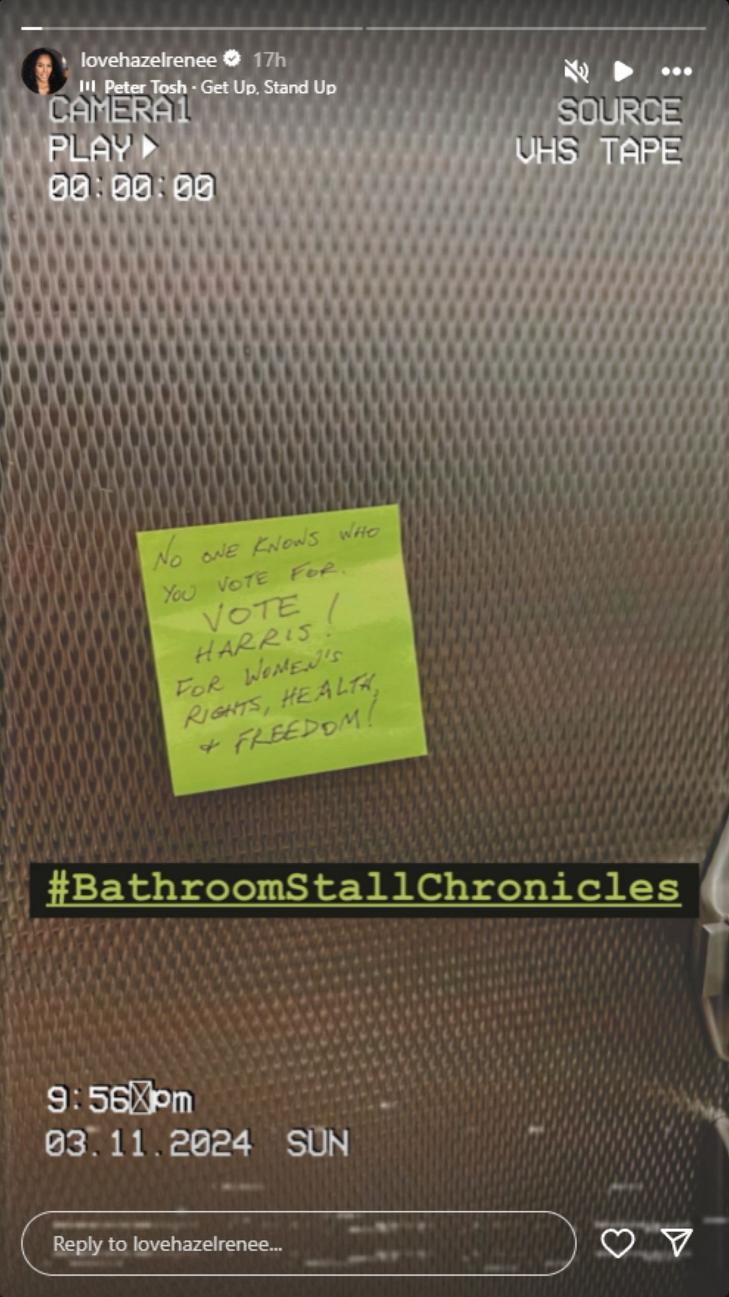 In a post on her Instagram stories, Renee seemingly endorsed Harris for the upcoming election. She took a photo of a note in a bathroom stall encouraging women to vote for the incumbent vice president.